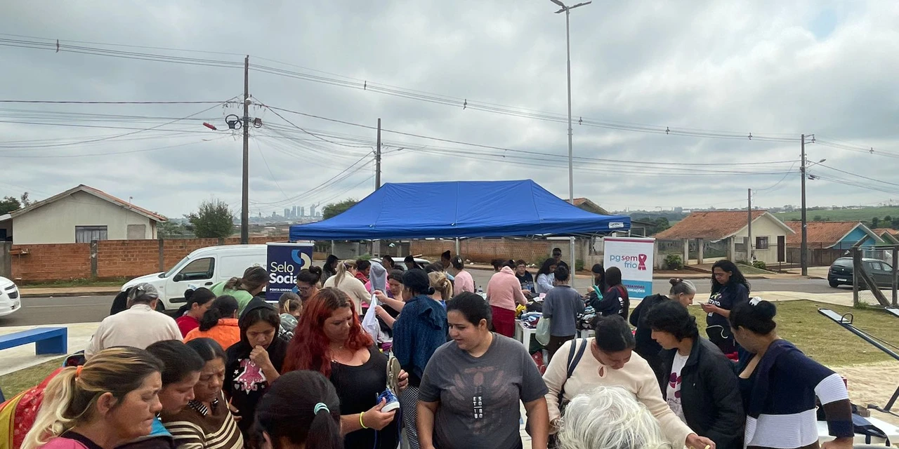 COM ASSESSORIAS - A ação de entrega das doações da Campanha PG Sem Frio, realizada nesta quarta-feira (16), lotou a praça do Recanto Verde. Toda a comunidade pode participar e levar para casa agasalhos, calçados, acessórios de inverno e cobertores.