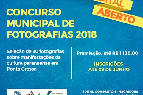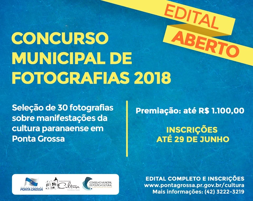 IMPRENSA/Ponta Grossa - Termina nesta sexta-feira, 29 de junho, as inscrições para o Concurso Municipal de Fotografias 2018, realizado pela Prefeitura de Ponta Grossa, por meio da Fundação Municipal de Cultura, e pelo Conselho Municipal de Política Cultural. O concurso é aberto a fotógrafos amadores e profissionais, maiores de 18 anos, domiciliados em Ponta Grossa. Cada proponente poderá enviar de uma a três fotografias que registrem diferentes manifestações da cultura paranaense na cidade. As inscrições podem ser feitas pelo