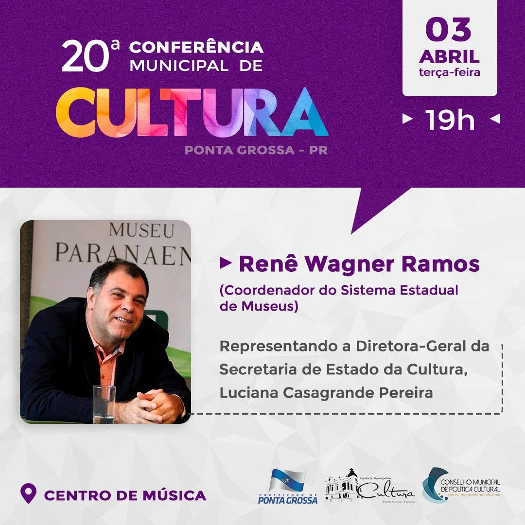 Luana Caroline Nascimento/Ponta Grossa - Inicia nesta quarta-feira, 03 de abril, a 20ª Conferência Municipal de Cultura, promovida pela Prefeitura de Ponta Grossa, pela Fundação Municipal de Cultura e pelo Conselho Municipal de Políticas Culturais (CMPC). A abertura será às 19h, no Centro de Música, com a presença de Renê Wagner Ramos - Coordenador do Sistema Estadual de Museus, representando a Diretora-Geral da Secretaria de Estado da Cultura, Luciana Casagrande Pereira.