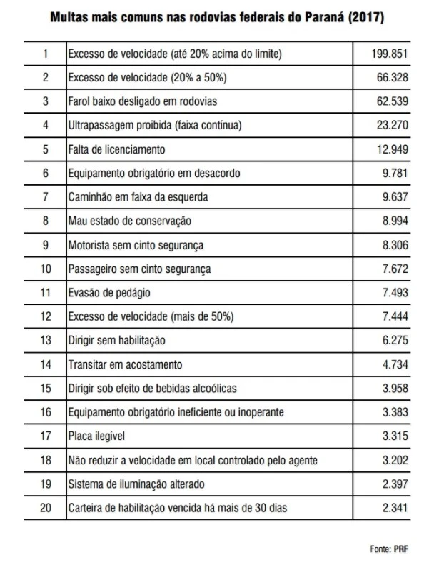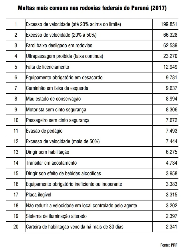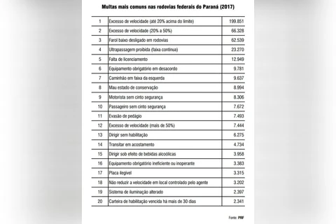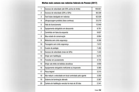 IMPRENSA/PRF - A Polícia Rodoviária Federal (PRF) divulgou nesta terça-feira (23) a lista das 20 infrações de trânsito mais registradas pelo órgão durante o ano de 2017 no Paraná.