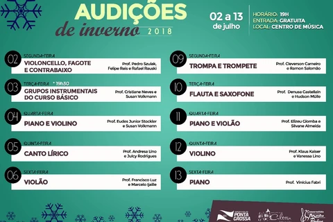 Para iniciar a programação, na próxima segunda-feira, 2 de julho, a audição será com os alunos de violoncello, fagote e contrabaixo (esta, excepcionalmente, começando às 19h30). Na terça-feira, 3, será com os alunos dos Grupos Instrumentais do Curso Básico. No dia 4, quarta-feira, a agenda é por conta dos alunos de violino e piano. A audição de canto lírico será na quinta-feira, 5, e para fechar a primeira semana, na sexta-feira, 6, a atividade é com os alunos de violão. A segunda semana de audições começa no dia 9, com a apresentação de trompa e trompete. No dia 10, terça-feira, é a vez dos alunos de flauta e saxofone; na quarta-feira, 11, o som será do piano e violão; e no dia 12, quinta-feira, a audição de classe de violino. Para fechar a programação, no dia 13 de julho se apresentarão os alunos de piano.