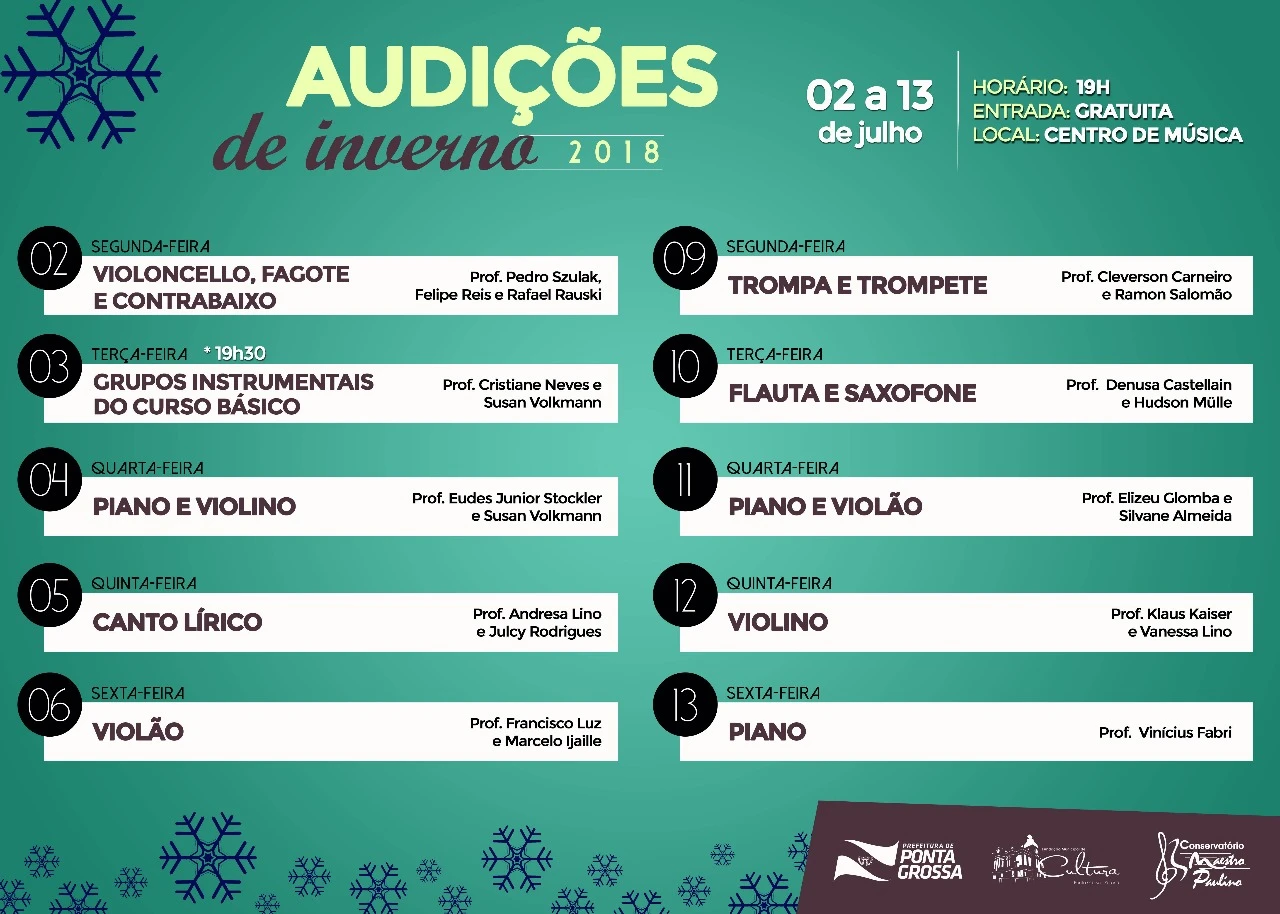 IMPRENSA/Ponta Grossa - Para encerrar o semestre letivo do Conservatório Maestro Paulino, escola de música mantida pela Prefeitura de Ponta Grossa, os alunos e professores realizam, a partir da próxima semana, as Audições de Inverno 2018. As apresentações serão dos dias 2 a 13 de julho, às 19h, no auditório do Centro de Música. A entrada é aberta ao público, que pode se encantar com a sonoridade de diversos instrumentos. Para os alunos do Conservatório, a presença na plateia garante o cumprimento da carga horária de prática artística.