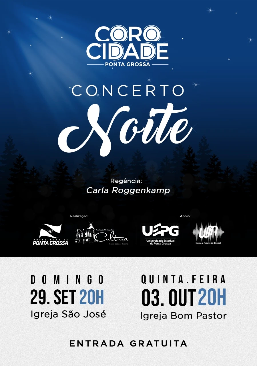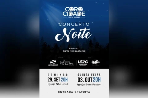Luana Caroline Nascimento/Ponta Grossa - O Coro Cidade de Ponta Grossa, grupo musical mantido pela Prefeitura de Ponta Grossa e Fundação Municipal de Cultura, estreia neste domingo, 29 de setembro, o concerto ‘Noite’, com regência da maestrina convidada Carla Roggenkamp. A apresentação será na Igreja São José, às 20h, com entrada gratuita. O concerto também acontecerá no dia 03 de outubro, na Igreja Luterana Bom Pastor, às 20h.