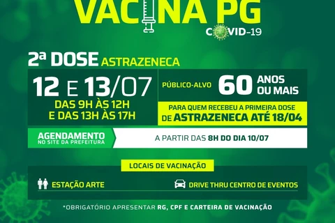 COM ASSESSORIAS - A Prefeitura de Ponta Grossa, através da Fundação Municipal de saúde (FMS), do Departamento de Imunização e da Atenção Primária, inicia, na próxima semana, a aplicação da segunda dose de Astrazeneca em pessoas com 60 anos ou mais, que receberam a primeira dose até dia 18 de abril. A vacinação acontece mediante agendamento no site oficial (
