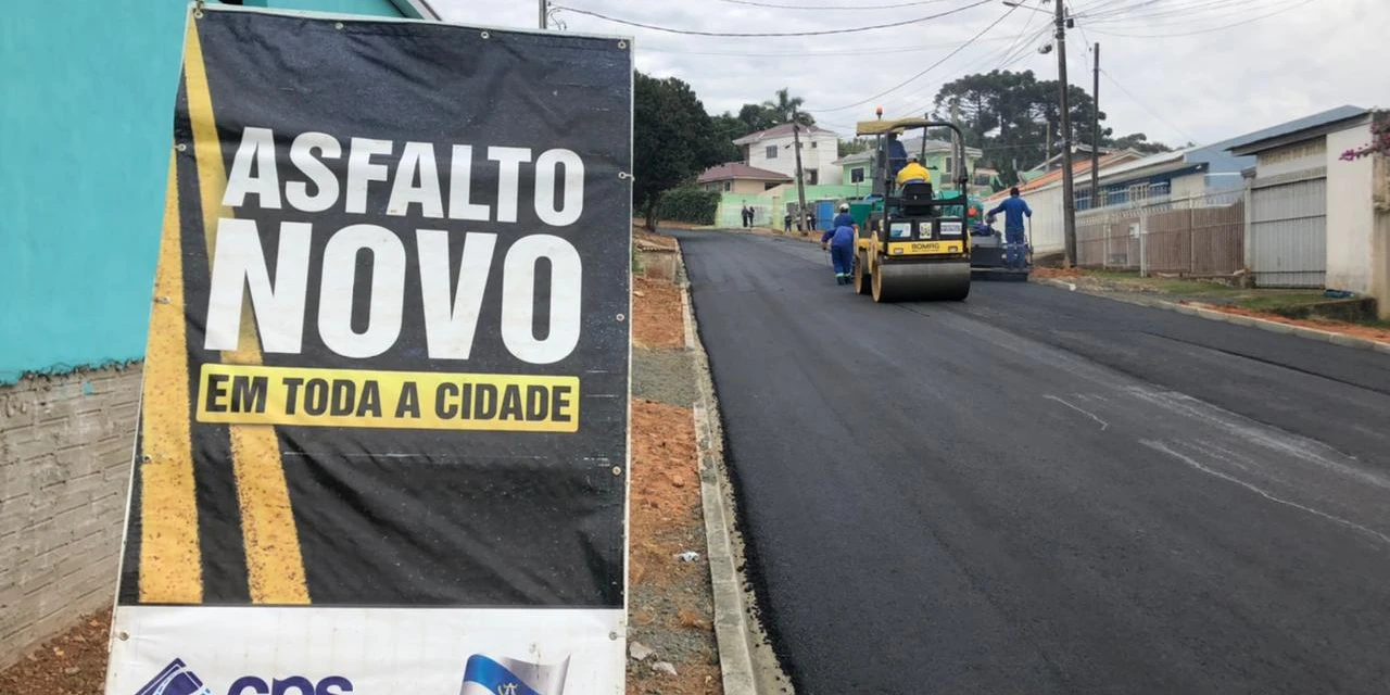 O programa "Asfalto Cidadão" oferta a contratação de pavimentação com parcelamento em até 60 vezes. A obra inclui terraplenagem, galerias pluviais, sub-base, base, meios-fios e asfalto.