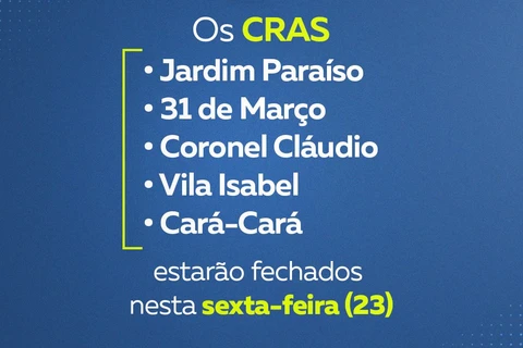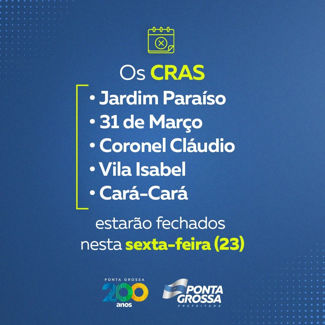 COM ASSESSORIAS - A Prefeitura Municipal de Ponta Grossa, através da Fundação de Assistência Social, informa que nesta sexta-feira (23) os CRAS Jardim Paraíso, 31 de Março, Coronel Cláudio, Vila Isabel e Cará-Cará estarão fechados em virtude da Festa Junina para os grupos do Serviço de Convivência e Fortalecimento de Vínculos (SCFV) e Serviço de Proteção e Atendimento Integral à Família (PAIF) das unidades.