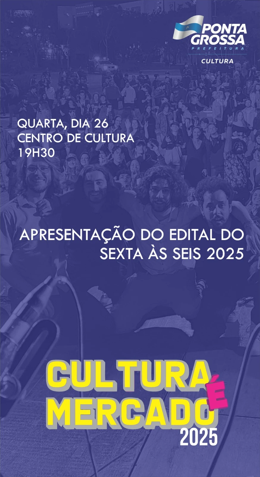 COM ASSESSORIAS - A Prefeitura de Ponta Grossa, através da Secretaria Municipal de Cultura (SMC), realiza nesta quarta-feira (dia 26) a primeira edição de 2025 do projeto ‘Cultura é Mercado’. O objeto da oficina será o edital do ‘Sexta às Seis’, que será apresentado a todos os interessados. A participação é gratuita e não é preciso se inscrever antecipadamente. O encontro acontece no Centro de Cultura, com início às 19h30.
