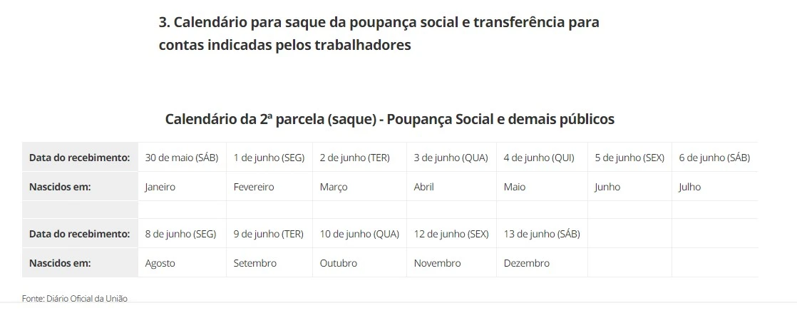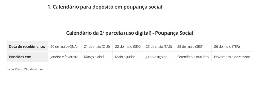 O calendário da segunda parcela vale apenas para quem recebeu a primeira parcela até 30 de abril. O governo não informou quando vai pagar a segunda parcela para quem receber a primeira depois desta data.