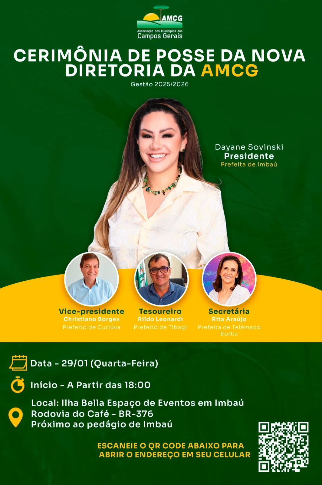 COM ASSESSORIAS - A cerimônia de posse da nova diretoria da Associação dos Municípios dos Campos Gerais (AMCG) será realizada no próximo dia 29 de janeiro (quarta-feira), no município de Imbaú. A solenidade que marca o início da gestão 2025/2026 ocorrerá no Espaço de Eventos Ilha Bella a partir das 18h e será aberto a convidados e veículos de imprensa. (Confira as informações abaixo).