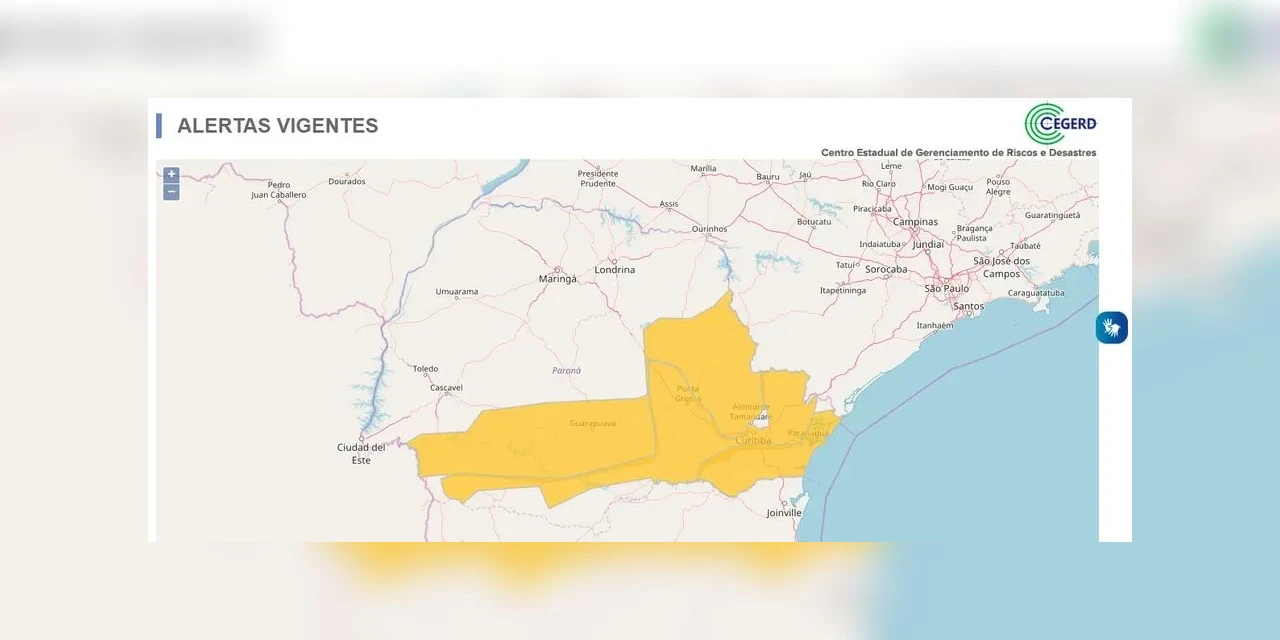 A Defesa Civil emitiu, nesta quinta-feira (10), um novo alerta sobre o risco de tempestades no Paraná. O aviso de chuvas intensas, vendavais e raios é válido para todo o sul e leste do Estado.