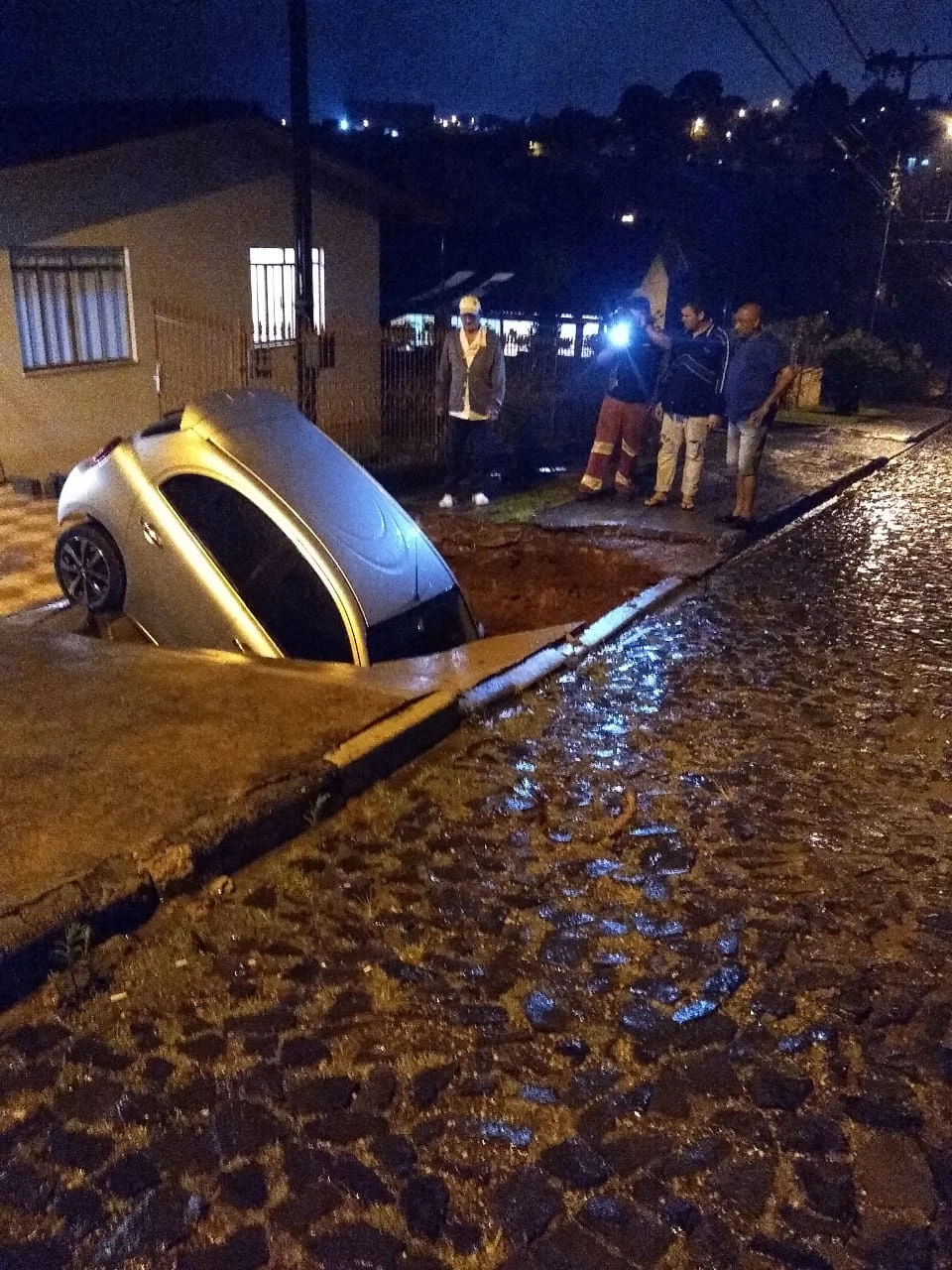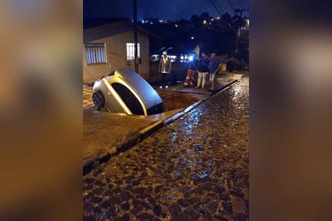 Na primeira situação, houve o desmoronamento de parte da calçada em frente a uma residência, causando a queda de um veículo no buraco que se abriu. Ninguém ficou ferido.