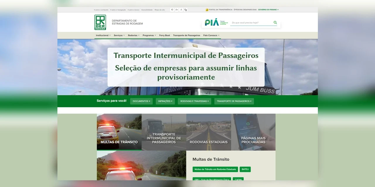 O portal enfatizou informações sobre multas, transporte de passageiros e rodovias estaduais – os três temas que mais registraram interesse, de acordo análise do serviço Google Analytics – atendimentos via Ouvidoria e no portal Paraná Inteligência Artificial (PIA) do Governo do Estado. A ideia é que usuários da versão antiga continuem encontrando as páginas de interesse, e que novos usuários encontrem toda a informação que precisam com facilidade.