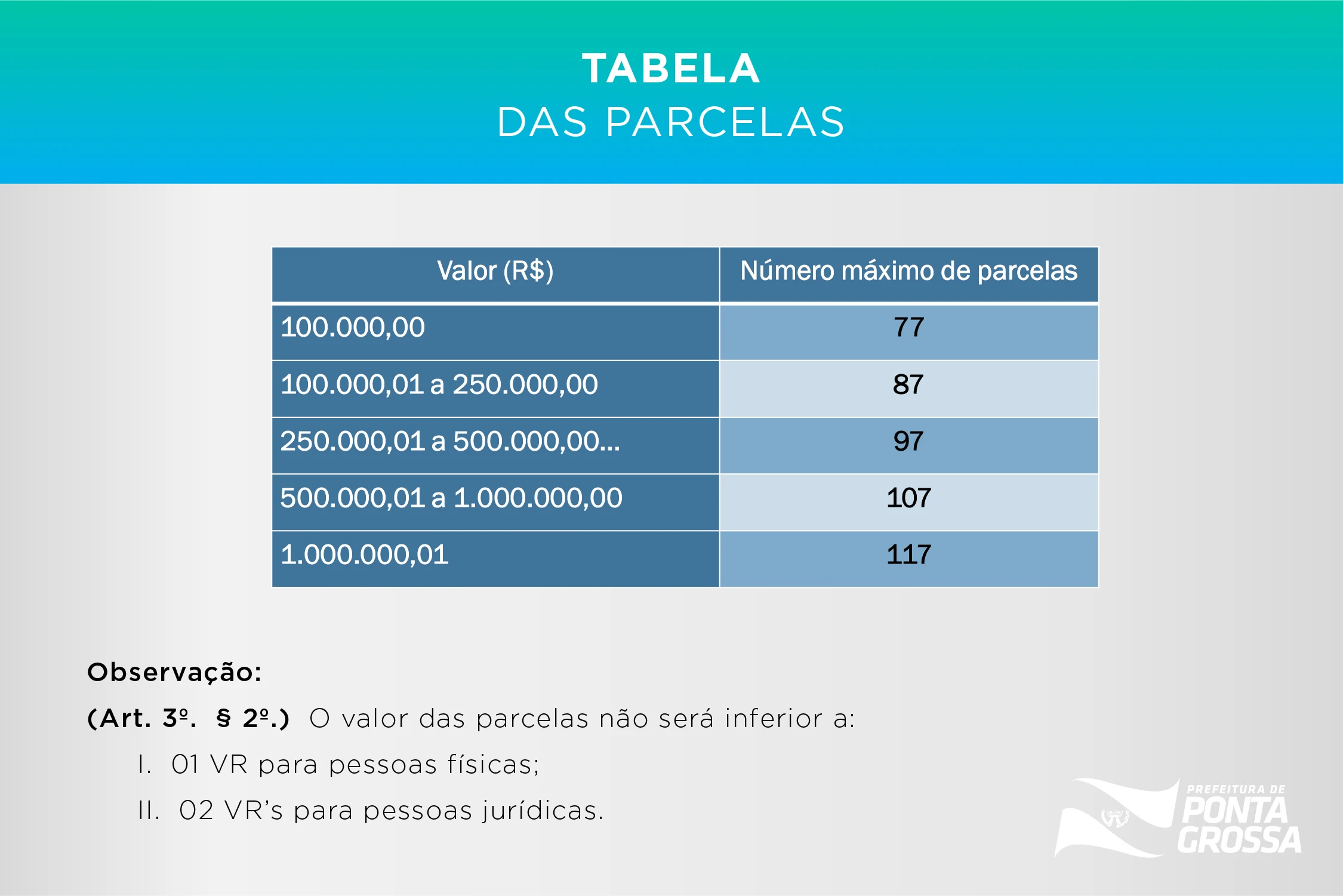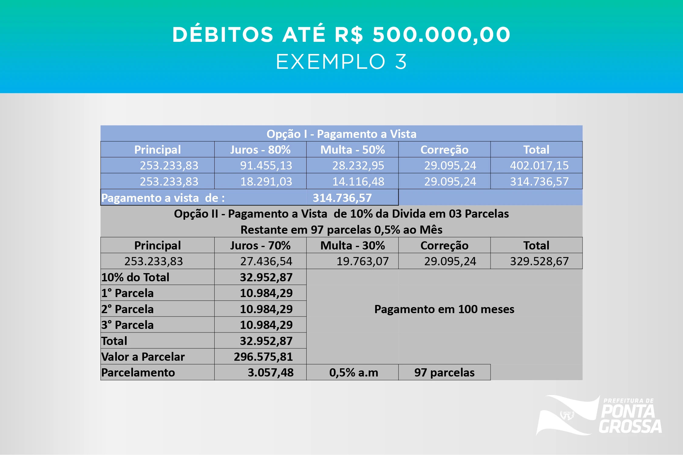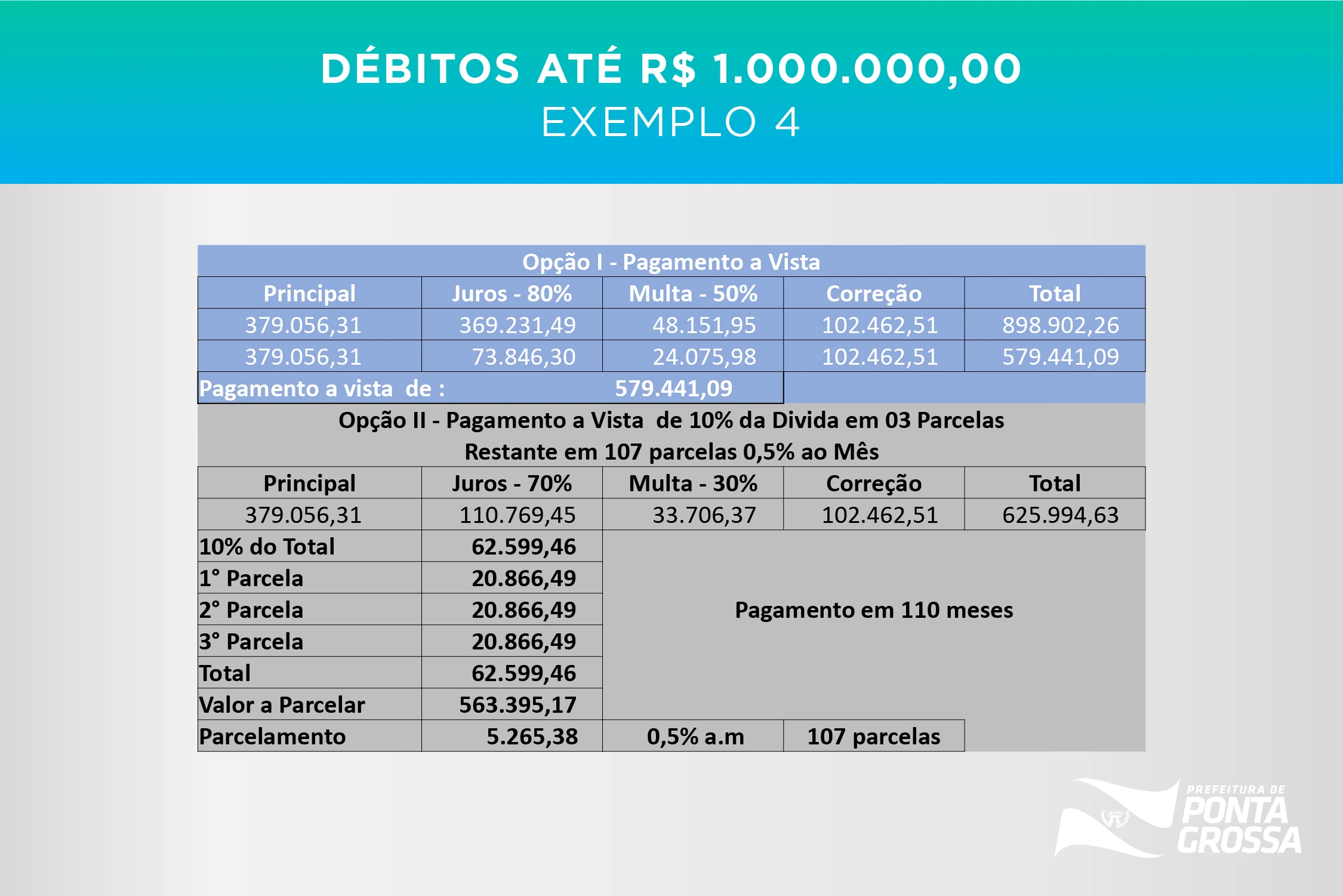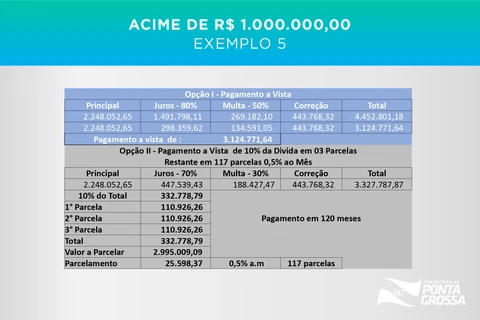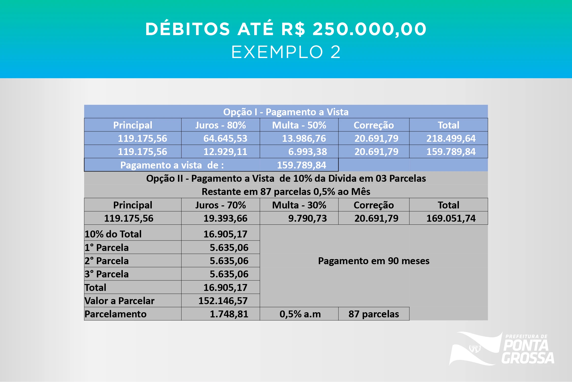 Para dívidas entre R$ 100 mil e R$ 250 mil, o parcelamento máximo será de 87 meses; entre R$ 250 mil a R$ 500 mil, até 97 parcelas mensais; de R$ 500 mil a R$ 1 milhão, o parcelamento será até 107 meses; e o valores devidos acima de R$ 1 milhão, o parcelamento máximo será em 117 vezes. Em todos os casos, será exigido o pagamento de entrada de 10% do valor total da dívida, dividido em três vezes. Quem optar pelo pagamento à vista, terá desconto de 80% do juros de mora e 50% da multa, enquanto aquele que optar pelo parcelamento contará com desconto de 70% do juros de mora e 30% da multa. Nesse programa, os juros serão de 0,5% ao mês.