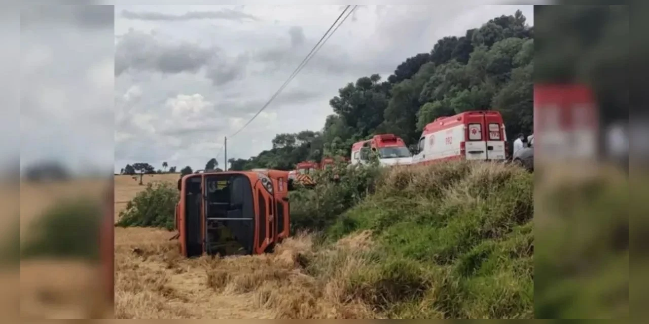 Um ônibus do transporte coletivo de Ponta Grossa, na região dos Campos Gerais do Paraná, sofreu um grave acidente na tarde desta segunda-feira (21), na PR-438. No Distrito de Guaragi, em uma região rural da cidade, o veículo tombou para fora da rodovia e ainda atingiu uma árvore. Pelo menos 10 pessoas ficaram feridas.
