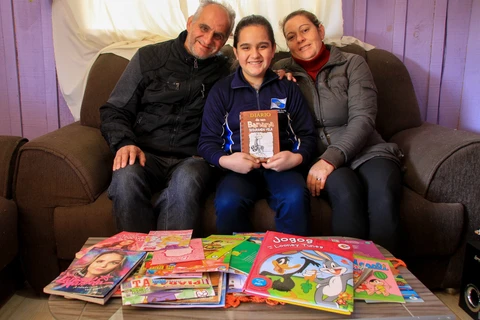 “A leitura que a gente já fazia, inclusive na igreja, somamos com o hábito dela e a gente foi se interessando por outras coisas, histórias, romances. Nós lemos bastante, ela gosta que o pai responda charadas”, narra o pai. A mãe conta que é notável o desenvolvimento da filha. “A leitura dela é hoje bem melhor do que antes. Ela tinha dificuldade no começo, mas depois que aprendeu, ficava lendo e queria que a gente ouvisse. Então a professora incentivou, ela se interessou mais e começamos a comprar para ler. Nós apoiamos, porque leitura é tudo, com certeza vai fazer diferença para um vestibular, vai ser muito importante”, fala a mãe.