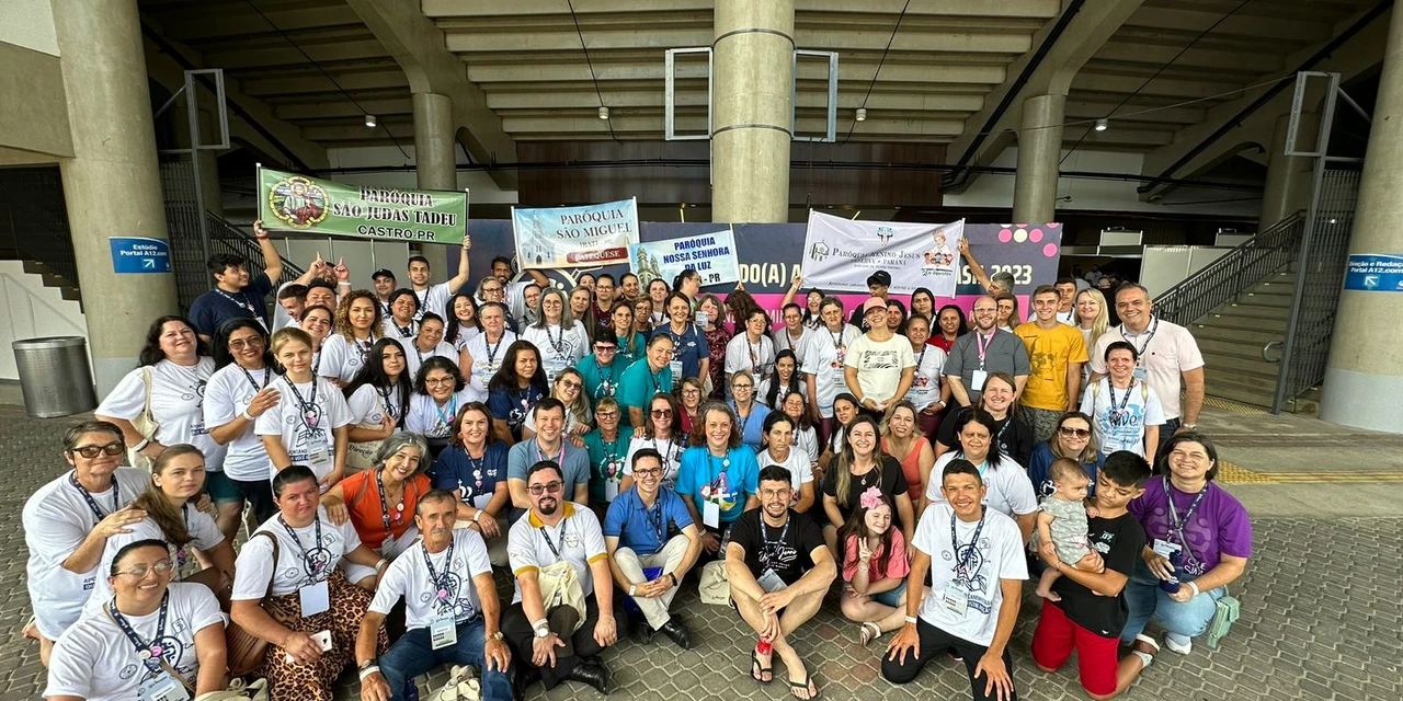 COM ASSESSORIAS - Catequistas de Castro (paróquias Sant'Ana e São Judas), Irati (Nossa Senhora da Luz e São Miguel), de Reserva (Senhor Menino Jesus), da Catedral Sant'Ana participaram, de 3 a 5 deste mês, em Aparecida (SP), do 4°Encontro Nacional de Catequistas, o 'Catequistas Brasil 2023'. Como palestrantes, representando a Diocese, estavam a coordenadora diocesana da Pastoral de Animação Bíblico-catequético, Flávia Carla Nascimento, padre Alexandre Spena Regueira, o seminarista Antônio Santos Júnior e José Renato da Luz, membro da equipe diocesana de Catequese.