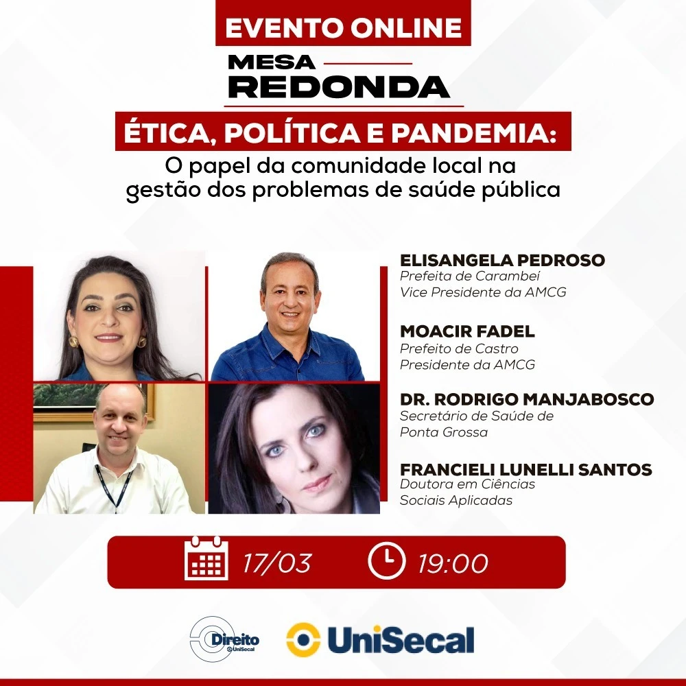 COM ASSESSORIAS - O curso de Direito da UniSecal promove nesta quarta-feira, dia 17, uma mesa redonda com o tema: "Ética, Política e Pandemia - o papel da comunidade local na gestão dos problemas de saúde pública". Serão quatro participantes na mesa, sendo o presidente da Associação dos Municípios dos Campos Gerais (AMCG) e prefeito de Castro, Moacyr Fadel, e a vice-presidente, e prefeita de Carambeí, Elisangela Pedroso. "A saúde pública é um tema que está sendo amplamente discutida entre o setor público. Avalio que envolver mais a comunidade é essencial já que precisamos somar todas as forças para vencer a Pandemia", avalia o presidente da AMCG.