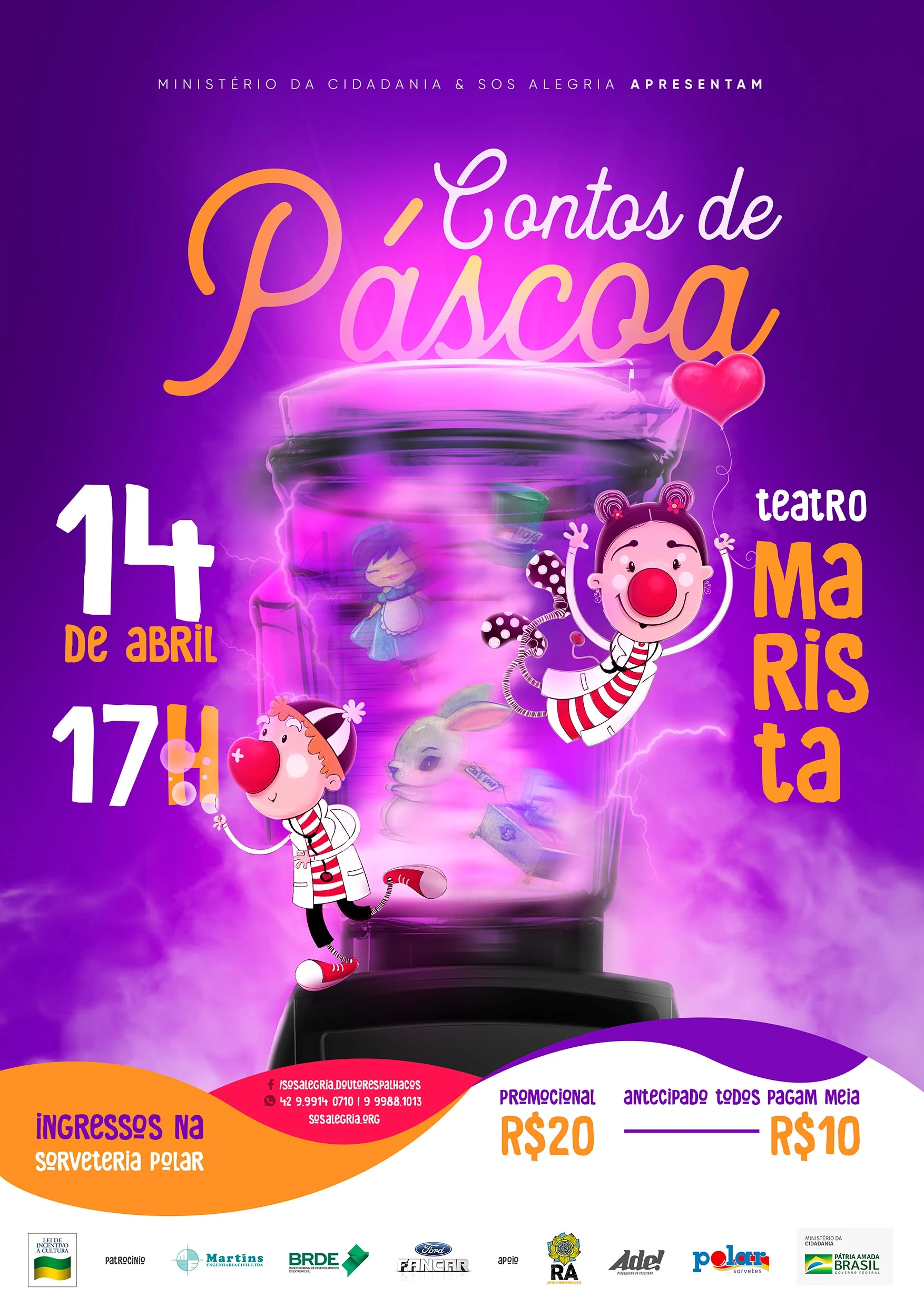 COM ASSESSORIAS - Respeitável público! A Organização Não Governamental Doutores Palhaços – SOS Alegria realiza no dia 14 de abril (domingo) o novo espetáculo ‘Contos de Páscoa”, desta vez o elenco mais engraçado de Ponta Grossa viverá uma aventura no mundo das histórias infantis.