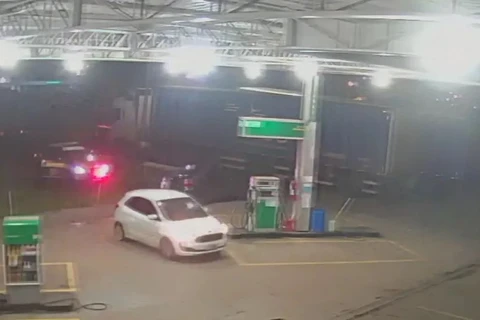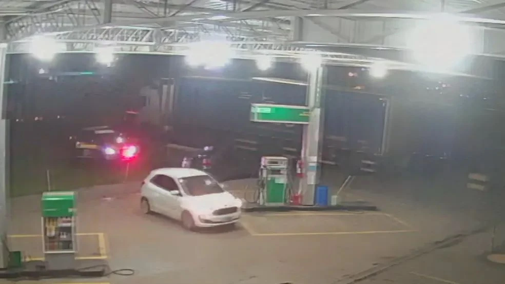 Nas imagens é possível observar o momento em que o carro se aproxima do posto, logo atrás dele está uma viatura da Polícia Rodoviária Federal (PRF). O motorista do carro abre a porta e, com o veículo ainda em movimento, desce e sai correndo.