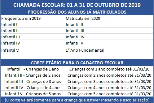 A partir deste ano, a Secretaria Municipal de Educação oficializa o corte etário de 31 de março, que passou a ser realizado em todo o país. Desta forma, a criança precisa ter completado a idade até esta data para poder ingressar na série correspondente. Essa regra vale somente para os alunos novos. Para os que já estão matriculados, a sequência segue normal para a série seguinte (veja tabela).