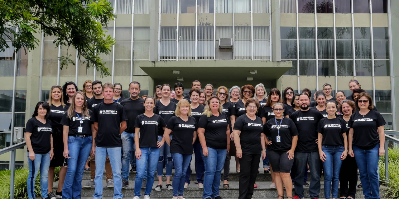 IMPRENSA/Ponta Grossa - Funcionários da Secretaria Municipal de Educação de Ponta Grossa fizeram, nesta quarta-feira (18), uma rápida intervenção para registrar apoio à valorização da escola pública e também pela urgente aprovação do novo Fundo Nacional de Desenvolvimento da Educação Básica (FUNDEB). Durante todo o dia, os profissionais da Educação usaram camisetas pretas com a frase #Eu defendo a educação pública.