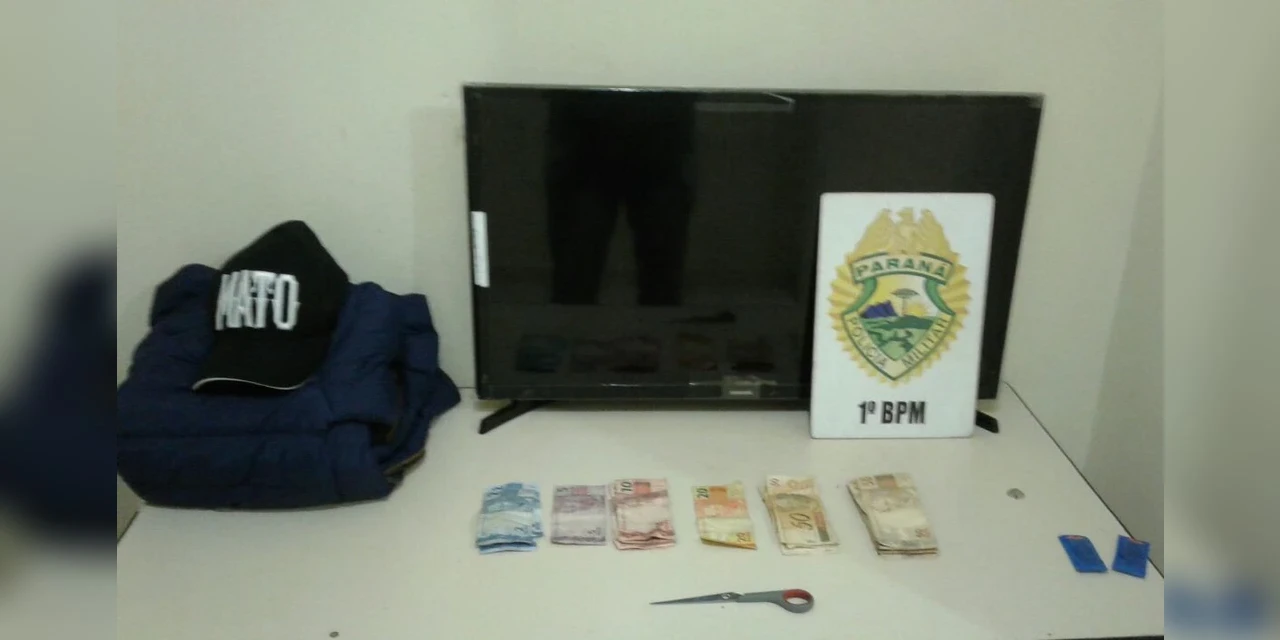 Ainda no sábado, no início da noite, um rapaz adentrou um estabelecimento comercial na área central da cidade e, portando parte de uma tesoura, deu voz de assalto, roubando o dinheiro do caixa e um aparelho televisor. O infrator, de 25 anos, acabou preso pela PM instantes depois do crime. Com ele os policiais apreenderam a TV e o dinheiro roubados.