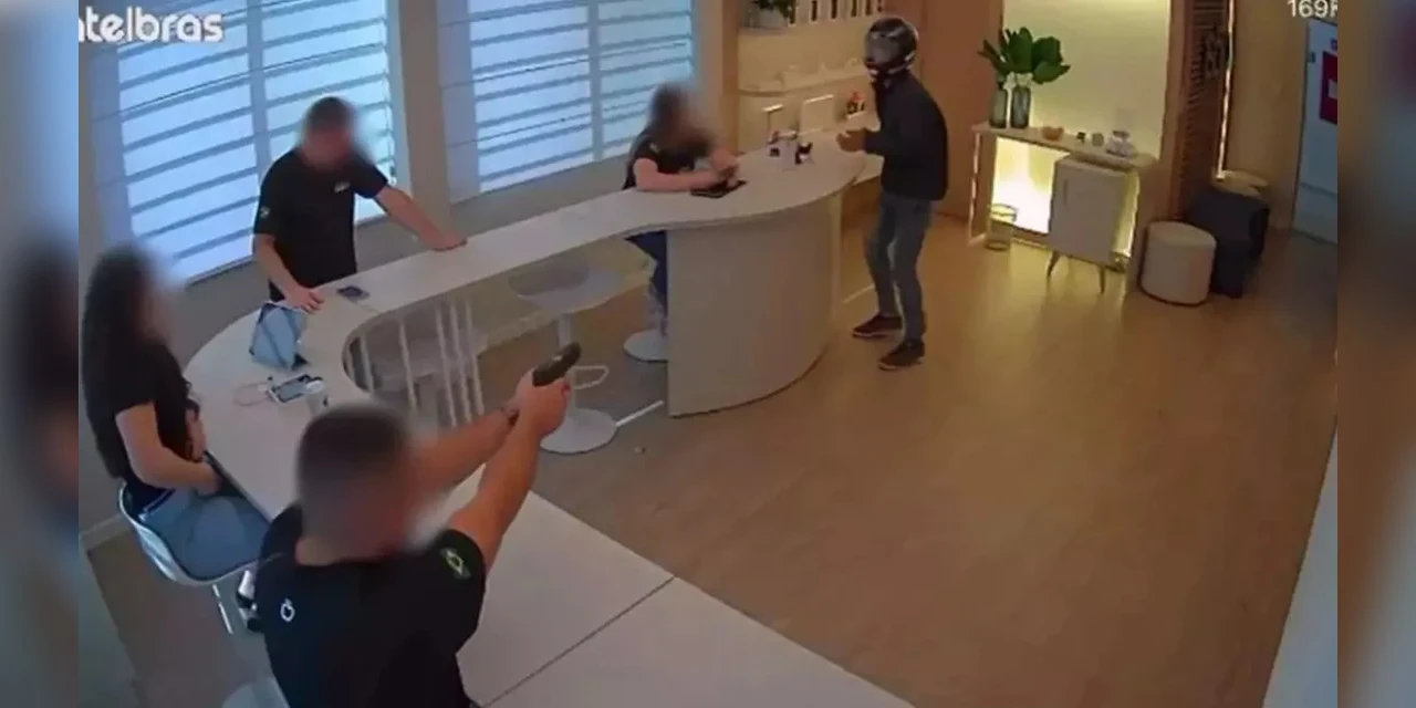 O momento da tentativa de assalto foi registrado pelas câmeras de segurança da loja. Na gravação é possível ver quatro trabalhadores no local. Em seguida, o suspeito acessa o local, se aproxima de uma vendedora e anuncia o crime. Logo depois, o proprietário reage e efetua os disparos.