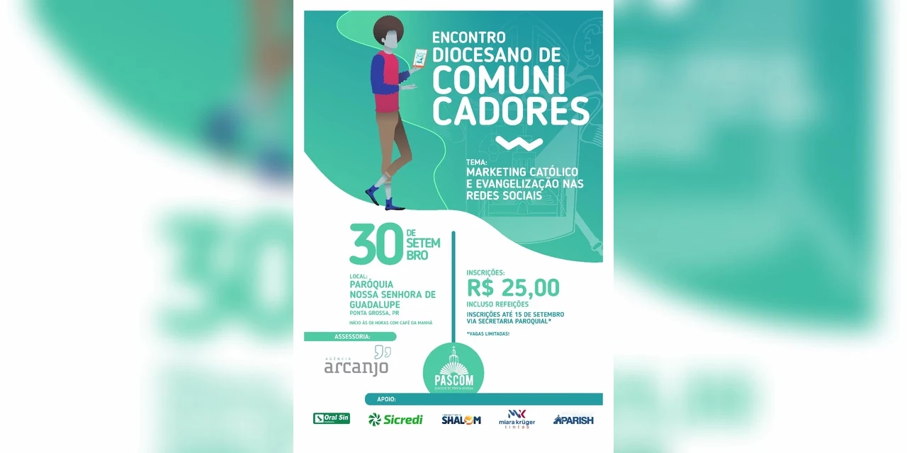 COM ASSESSORIAS - Cerca de 150 agentes das pastorais da Comunicação da Diocese de Ponta Grossa estão sendo esperados no Encontro de Comunicadores marcado para o dia 30 deste mês, na Paróquia Nossa Senhora de Guadalupe, no Núcleo Santa Paula, em Ponta Grosa. As inscrições devem ser feitas até este sábado (15), a R$ 25, nas secretarias paroquiais. O valor inclui as refeições e deverá ser pago no credenciamento, no dia do encontro. O número de vagas é limitado. São cinco vagas por paróquia. A programação inicia às 8 horas, com café da manhã.