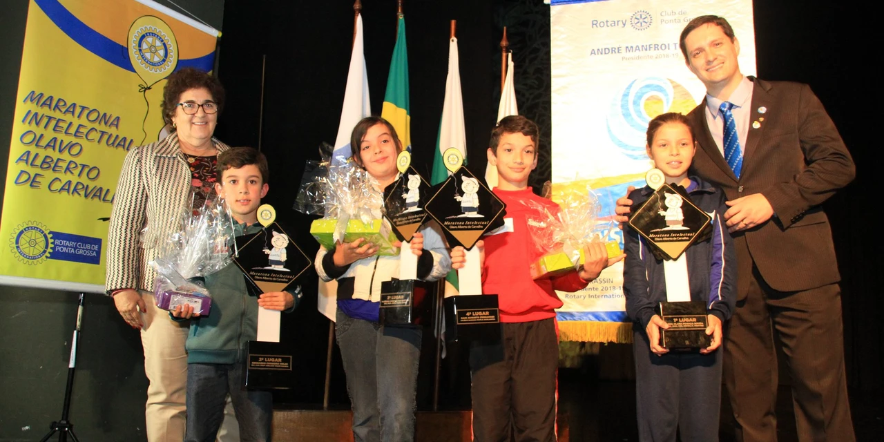 IMPRENSA/Ponta Grossa - Em uma noite de muita comemoração, o Rotary Club Ponta Grossa realizou a cerimônia de premiação da 64ª Maratona Intelectual Olavo Alberto de Carvalho, tradição que ocorre anualmente em Ponta Grossa. O destaque ficou com os alunos estudantes das escolas públicas municipais, que ficaram com quatro dos cinco primeiros lugares na prova sobre conhecimentos da Língua Portuguesa, Matemática e conhecimentos científicos, direcionada para alunos do 5º ano do Ensino Fundamental.
