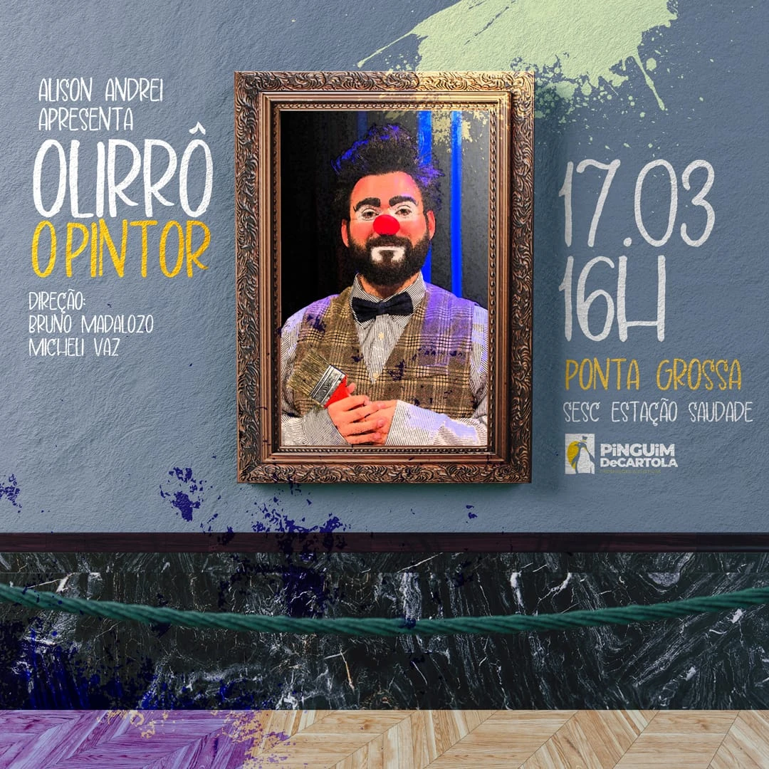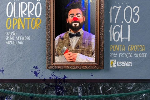 COM ASSESSORIAS - Neste domingo (17), o palco do Sesc Estação Saudade, às 16 horas, recebe o espetáculo Olirrô, o Pintor. Estrelado pelo ator Alisson Andrei, com direção de Bruno Madalozo e Micheli Vaz. O mundo da palhaçaria, em uma apresentação que celebra a vida. A entrada é franca, mas os ingressos são limitados e devem ser retirados no local com antecedência.
