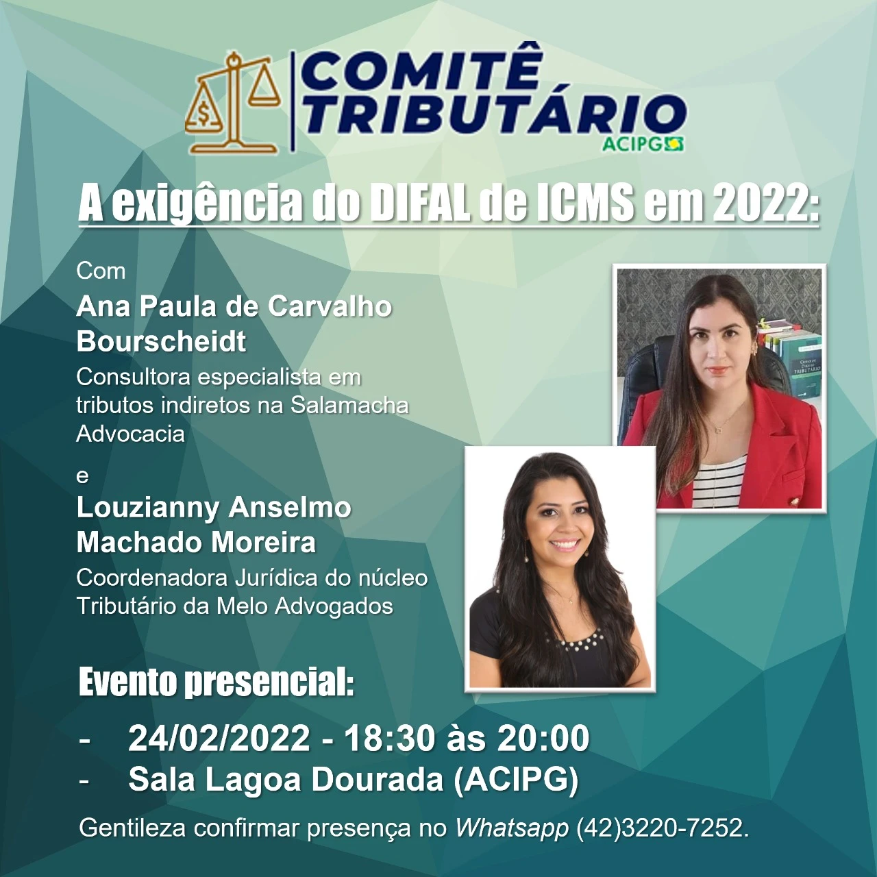 COM ASSESSORIAS - O Comitê Tributário da Associação Comercial, Industrial e Empresarial de Ponta Grossa (ACIPG) realiza nesta quinta-feira (24) um bate-papo com advogados para abordar a diferença de alíquota (DIFAL) do Imposto Sobre Circulação de Mercadorias e Serviços (ICMS).
