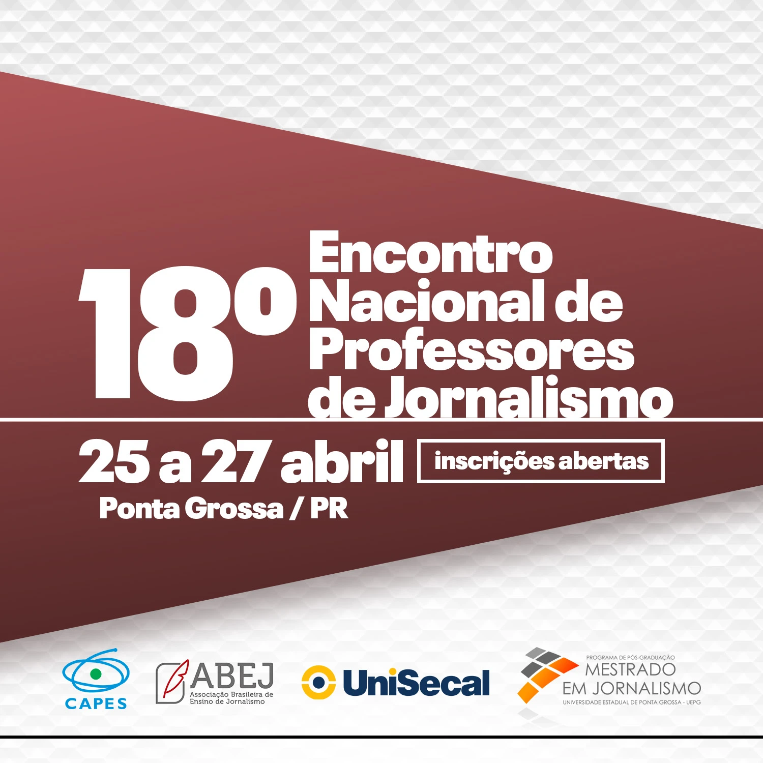 COM ASSESSORIAS - A cidade de Ponta Grossa (PR) receberá pela primeira vez o Encontro Nacional de Professores de Jornalismo (ENPJ) entre os dias 25 e 27 de abril de 2019. A décima oitava edição do evento é uma promoção da Associação Brasileira de Ensino de Jornalismo (Abej) e será realizado pelo curso de Jornalismo do Centro Universitário Santa Amélia (UniSecal), juntamente em parceria com o Departamento de Jornalismo (graduação e mestrado) da Universidade Estadual de Ponta Grossa (UEPG).