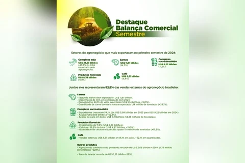 “O aumento nas sexportações no primeiro semestre de 2024 reflete não só a excelência dos nossos produtos, mas também o resultado dos recordes nas aberturas de mercado e o constante diálogo com outros países. O incentivo do governo e o apoio do setor e das associações têm sido fundamentais para esse crescimento, demonstrando a força e a competitividade do agronegócio brasileiro no cenário internacional, bem como a qualidade e o rigoroso controle sanitário dos nossos produtos”, destacou Roberto Perosa, secretário de Comércio e Relações Internacionais do Mapa.