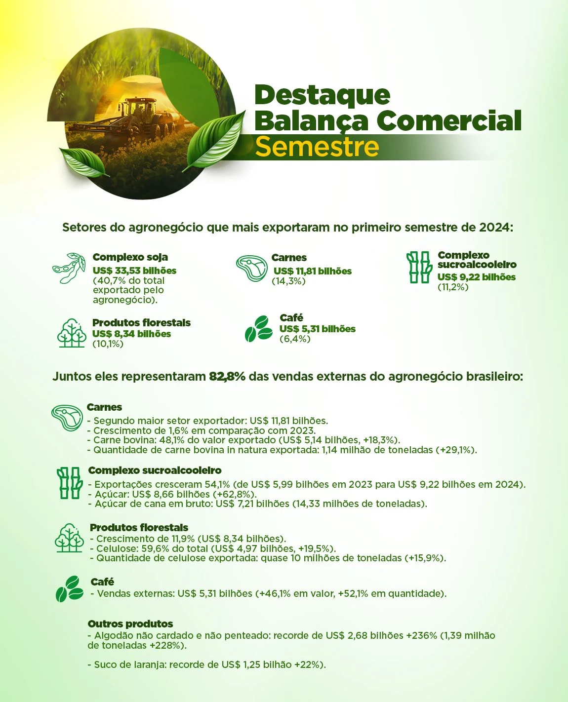 Neste período, os cinco principais setores do agronegócio brasileiro se destacaram significativamente nas exportações. O complexo soja liderou, alcançando US$ 33,53 bilhões, representando 40,7% do total exportado pelo agronegócio. Em seguida, o setor de carnes exportou US$ 11,81 bilhões, equivalentes a 14,3% das exportações do agronegócio. O complexo sucroalcooleiro registrou US$ 9,22 bilhões, correspondendo a 11,2% do total, enquanto os produtos florestais somaram US$ 8,34 bilhões, representando 10,1%. Por fim, o setor de café alcançou US$ 5,31 bilhões, o que equivale a 6,4% das exportações. Juntos, esses setores foram responsáveis por 82,8% das vendas externas do agronegócio brasileiro.
