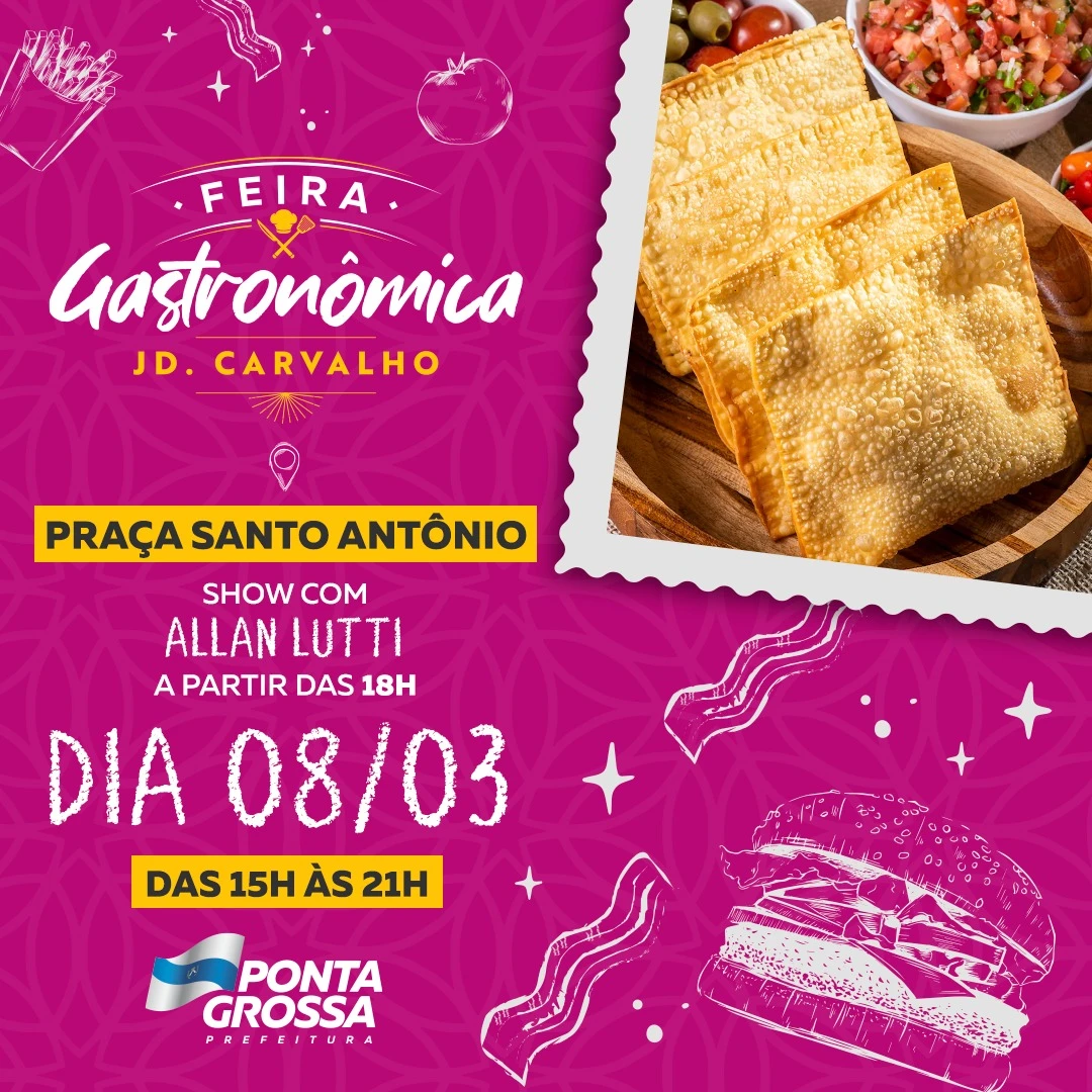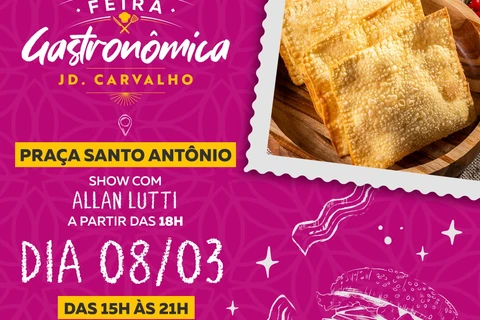 COM ASSESSORIAS - A Feira Gastronômica, que acontece semanalmente na Praça da Igreja Santo Antônio, no Jardim Carvalho, será especial nesta sexta-feira (08). O evento será alusivo ao "Dia da Mulher" e terá show musical com o cantor Allan Lutti, a partir das 18 horas.