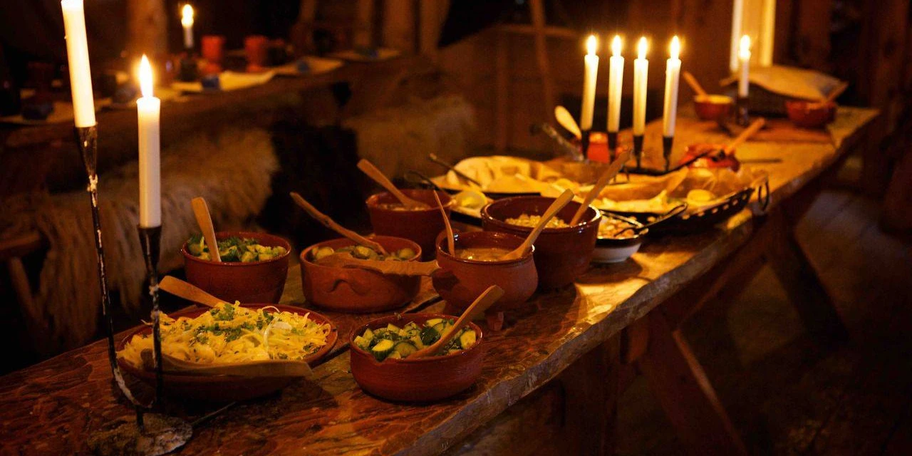 Queijos diversos; salames, linguiças, caldos de abóboras, pães escuros, pasta de alhos e cebolas.