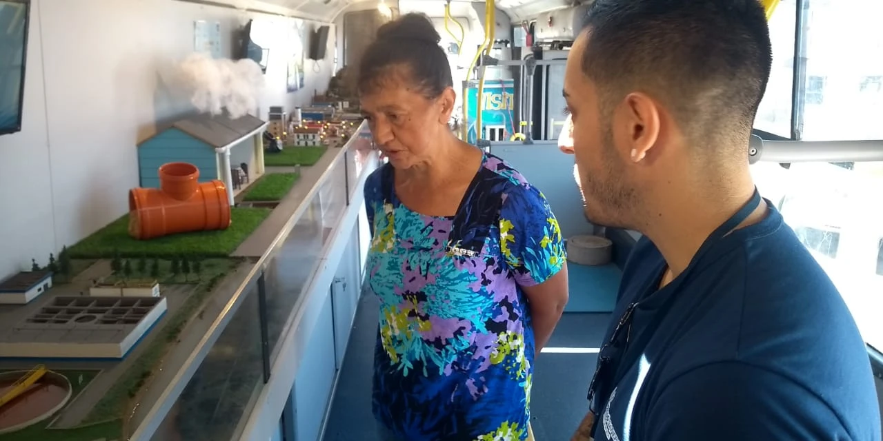 Assim que as pessoas entravam no ônibus, eram recepcionadas por técnicos ambientais e biólogos, que exibiam as maquetes e explanavam sobre o caminho da água e os principais cuidados que se deve ter para a sua preservação. A representação do ciclo da água, no ônibus, inclui a demonstração do percurso da água residuária, desde a saída das residências; uma estação de tratamento de esgoto; os processos de geração de energia a partir do gás metano, destinação do lodo de esgoto tratado para a agricultura; o tratamento adequado dos resíduos sólidos; dentre outros percursos importantes que o líquido percorre.