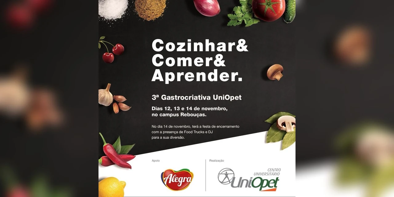 COM ASSESSORIAS - Nesta semana, a Alegra participa da 3ª edição da Gastrocriativa, evento gratuito realizado pela Uniopet que conta com cursos, chefs, desafios gastronômicos e food trucks. De 12 a 14 de novembro, diversas palestras serão realizadas por convidados, que irão abordar assuntos como o segredo da afiação de instrumentos, até curiosidades e dicas sobre carnes, cafés e cervejas.