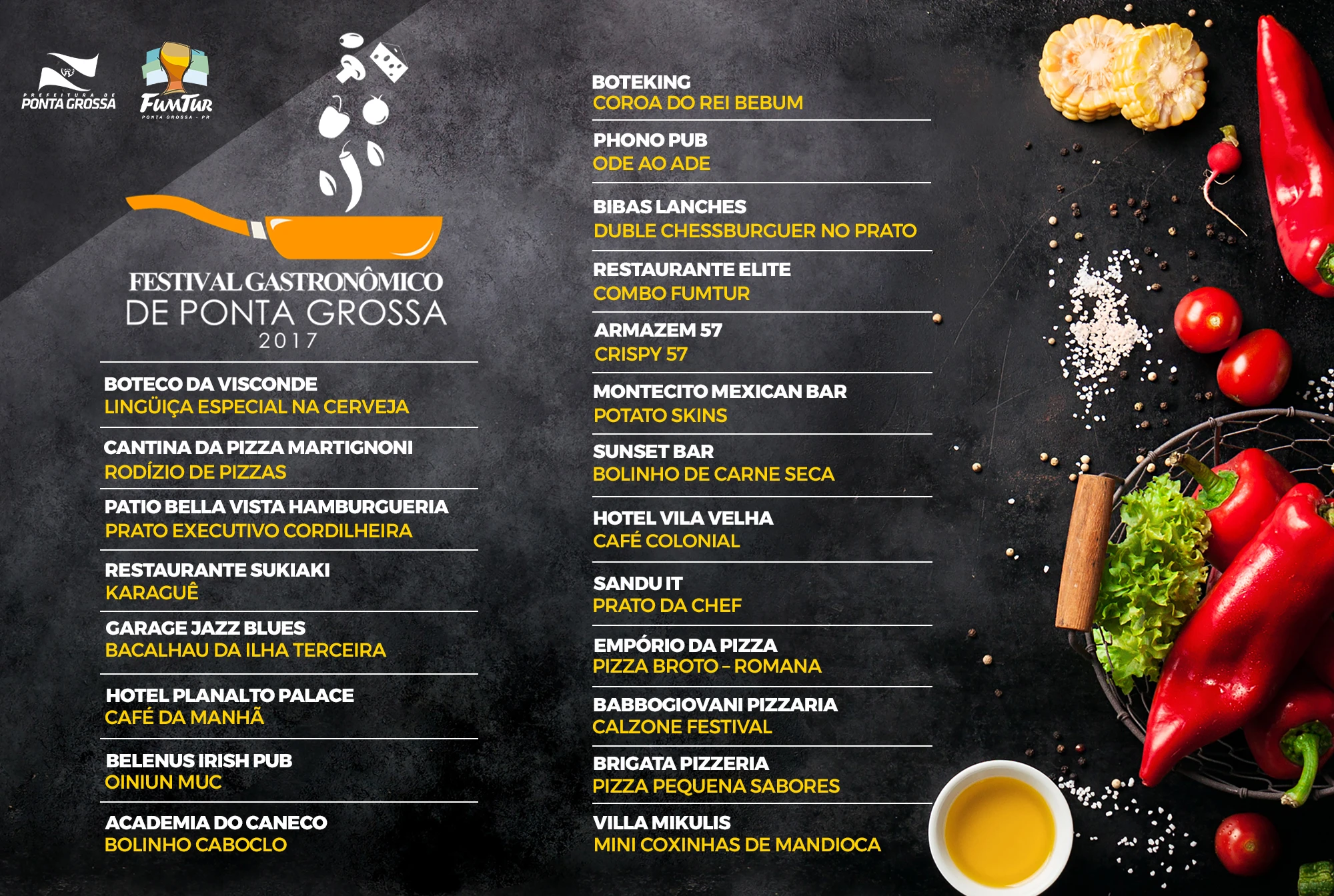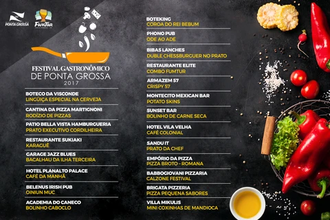 A Prefeitura Municipal de Ponta Grossa, através da Fundação Municipal de Turismo (Fumtur), está preparando para o mês de novembro o Festival Gastronômico de Ponta Grossa. O evento conta com 21 estabelecimentos parceiros, que estarão com pratos especiais para o Festival Gastronômico, a preço promocional de R$ 24,90. O Festival ocorrerá durante todo o mês, de 1 a 30 de novembro, em cada um dos estabelecimentos participantes.