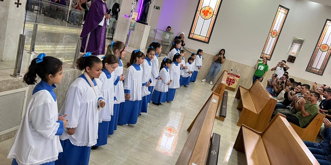 COM ASSESSORIAS - Neste domingo (26), na Paróquia Santa Rita de Cássia, no Bairro da Ronda, foram instituídas 15 novas meninas 'Filhas de Maria'. A instituição aconteceu durante a celebração das 10h30 e foi a segunda deste ano. Em janeiro, outras oito garotas foram instituídas. As primeiras da paróquia. Em outras comunidades, esse mesmo serviço é prestado pelas coroinhas e, em Piraí do Sul, na Paróquia Senhor Menino Deus, ele se chama 'Meninas de Maria', como conta o pároco da Santa Rita, Evandro Luis Braun, criador do grupo com esse nome, em Ponta Grossa.