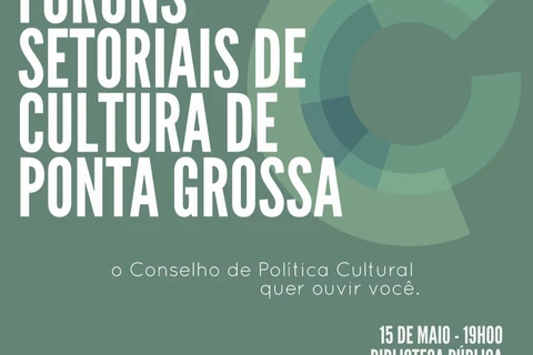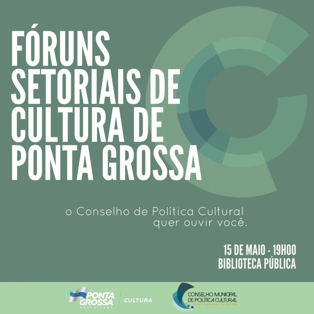COM ASSESSORIAS - A Prefeitura de Ponta Grossa, através da Secretaria Municipal de Cultura, e o Conselho Municipal de Política Cultural realizam, no dia 15 deste mês, os Fóruns Setoriais de Cultura de Ponta Grossa. Todas as atividades serão concentradas no espaço da Biblioteca Pública Municipal, a partir das 19 horas.