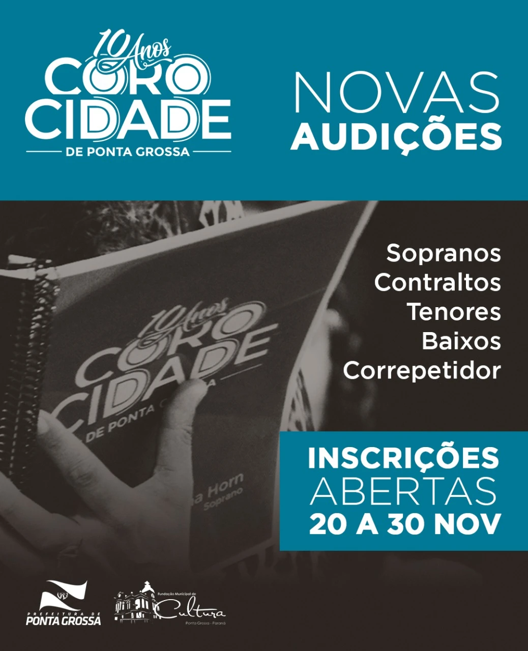 www.pontagrossa.pr.gov.br/cultura. As listas com as inscrições homologadas serão publicadas até o dia 04 de dezembro, com o dia e horário das audições individuais. As audições serão realizadas no Centro de Música, nos dias 08 e 09 de dezembro (para o Coro) e 17, 18 e 19 de dezembro (para a Orquestra).