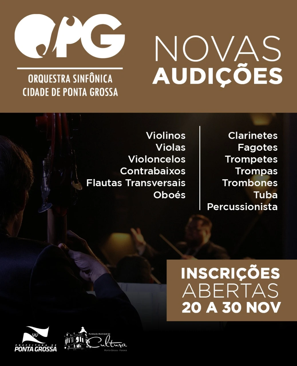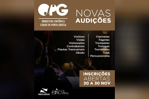 Luana Caroline Nascimento - Seguem abertas até o dia 30 de novembro as inscrições para os novos integrantes da Orquestra Sinfônica e do Coro Cidade de Ponta Grossa, corpos artísticos mantidos pela Prefeitura de Ponta Grossa, por meio da Fundação Municipal de Cultura. Para ingressar, é necessário que o candidato esteja cursando música em escola reconhecida ou no Conservatório Maestro Paulino, ou ainda já possua graduação em música. Serão selecionados 75 músicos e cantores bolsistas.