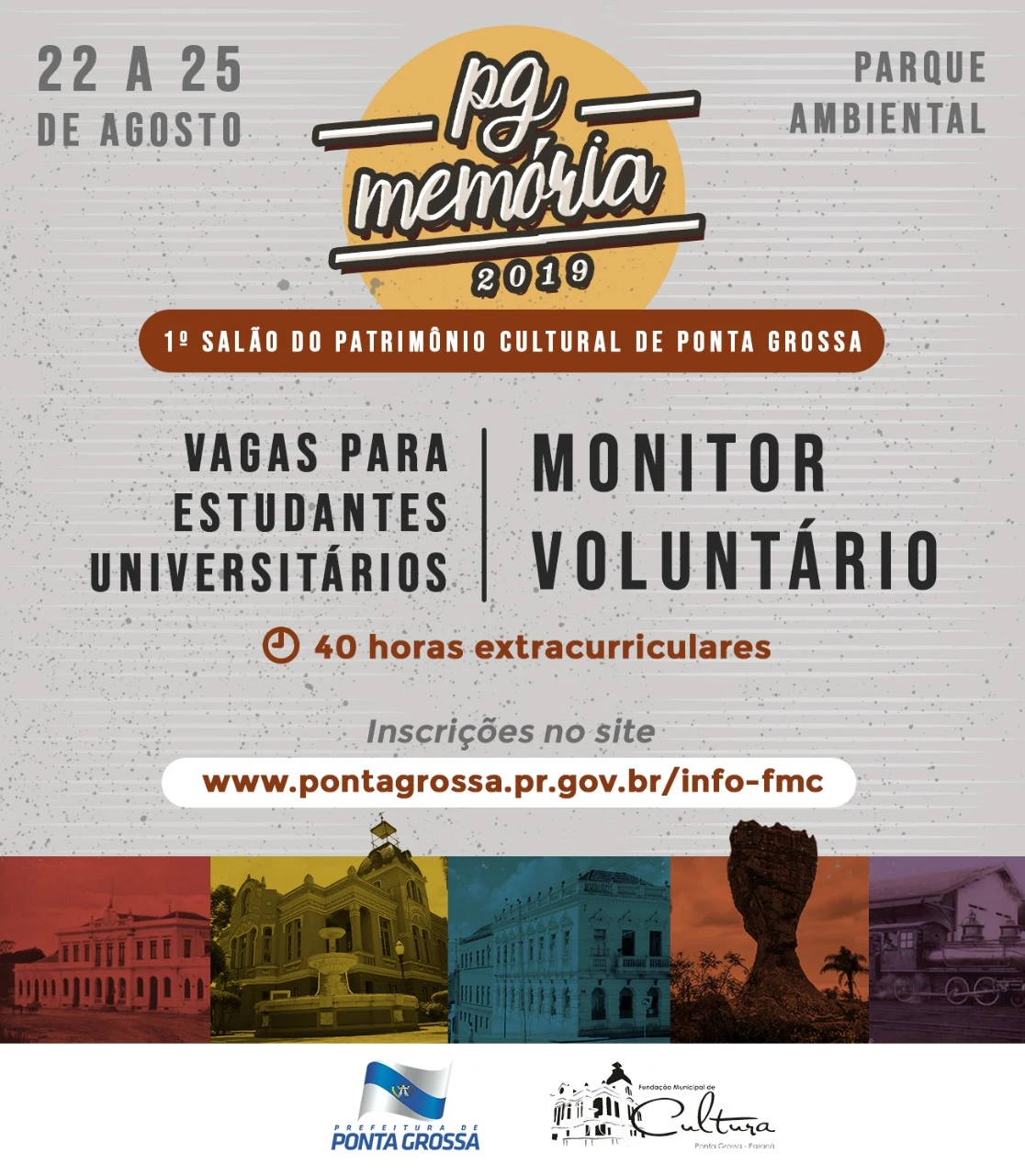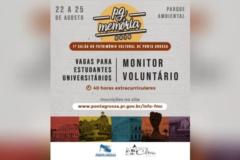 Luana Caroline Nascimento/Ponta Grossa - Em agosto, a Prefeitura de Ponta Grossa e a Fundação Municipal de Cultura irão promover o 1º Salão do Patrimônio Cultural de Ponta Grossa. O ‘PG Memória’ irá reunir, no Parque Ambiental, palestras, oficinas, minicursos e apresentações musicais. A partir desta quarta-feira, 17, estudantes universitários podem se inscrever pelo site