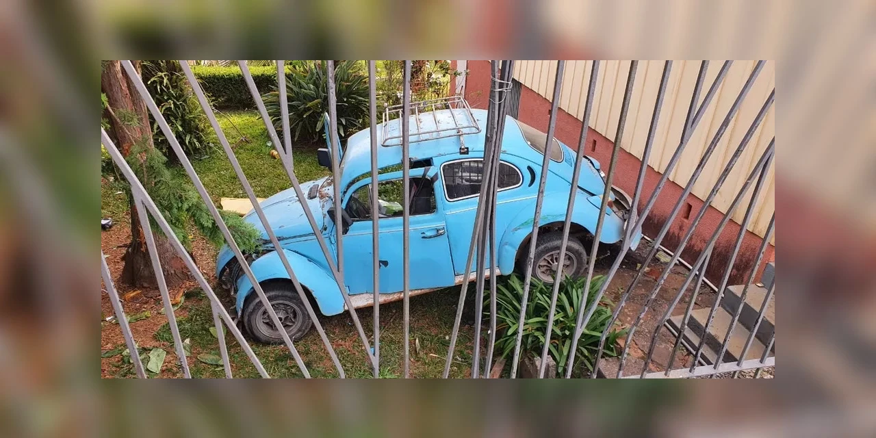 Uma câmera de segurança registrou um Fusca invadindo uma casa em Ponta Grossa, nos Campos Gerais do Paraná, na quarta-feira (14). Segundo a Polícia Militar, antes de atingir o gradil da residência, o carro também bateu em outro veículo estacionado.