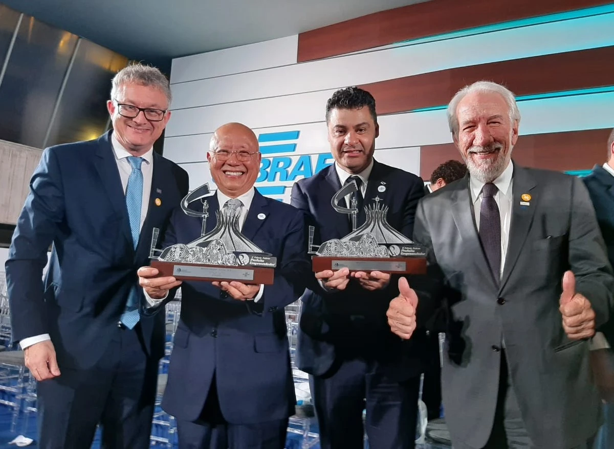 COM ASSESSORIAS - O Sebrae realizou, na noite desta quarta-feira (5), em Brasília, a solenidade de entrega do Prêmio Sebrae Prefeito Empreendedor (PSPE) a 14 gestores municipais de todas as regiões do Brasil. Na edição deste ano, foram inscritos 1.160 projetos que tiveram como objetivo a melhoria do ambiente de negócios para as micro e pequenas empresas, além dos microempreendedores individuais (MEI). Os prefeitos paranaenses Hiroshi Kubo, de Carlópolis, e Marcelo Rangel Cruz de Oliveira, de Ponta Grossa, foram premiados, respectivamente, nas categorias Pequenos Negócios no Campo e Políticas Públicas para Desenvolvimento dos Pequenos Negócios.