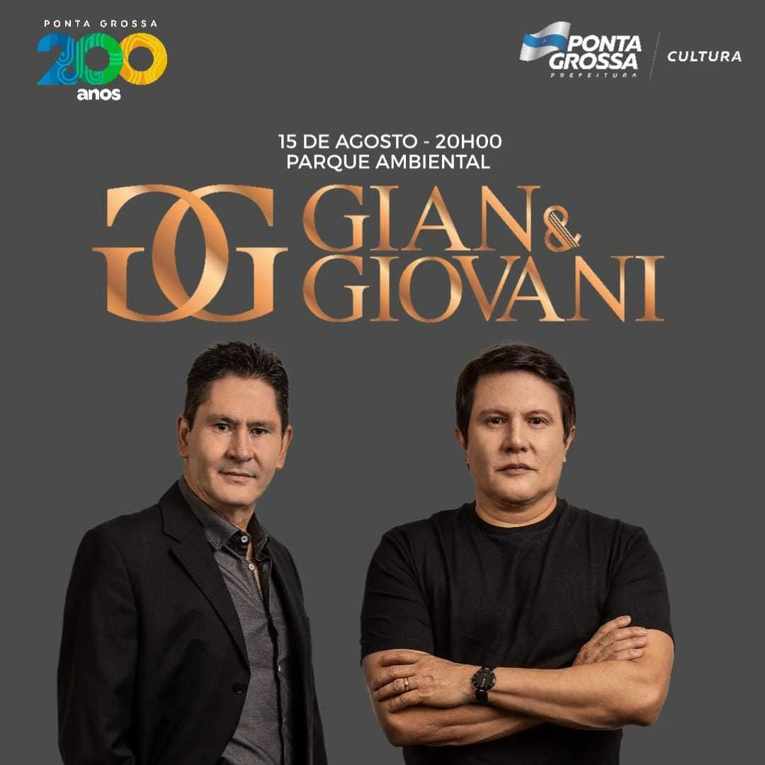 COM ASSESSORIAS - Os sertanejos Gian e Giovani se apresentam nesta terça-feira, dia 15, no Parque Ambiental em show alusivo aos 200 anos de Ponta Grossa. O show está previsto para iniciar às 20 horas. Antes, a partir das 19 horas, o cantor Maik faz a abertura da programação. A apresentação é gratuita e promete atrair grande número de fãs da tradicional dupla e do estilo sertanejo tradicional. A promoção é da Prefeitura, através da Secretaria Municipal de Cultura.
