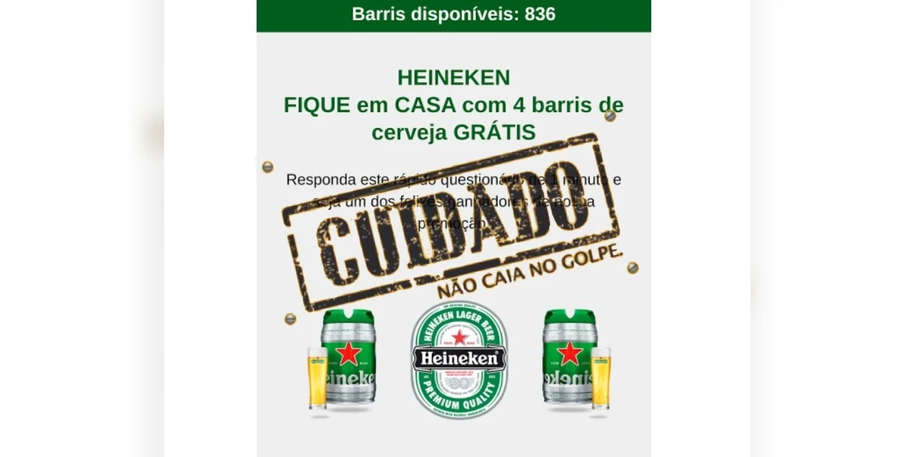 BANDA B - Um novo golpe que circula pelo WhatsApp promete quatro barris de cerveja grátis e está se espalhando rapidamente. De acordo com o PSafe, laboratório especializado em segurança digital, os criminosos usam o nome da Heineken e já fizeram 159 mil vítimas.