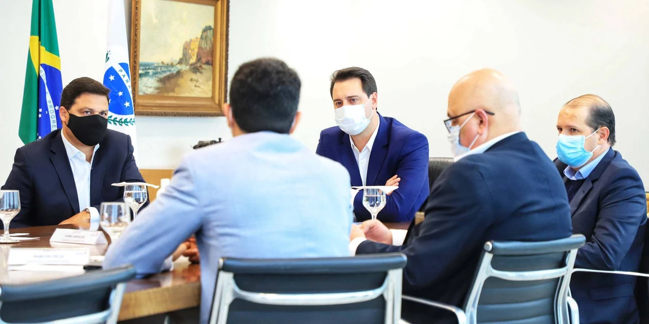 PRESENÇAS – Compareceram à reunião o secretário estadual da Infraestrutura e Logística, Sandro Alex; o secretário estadual de Administração e Previdência, Marcel Micheletto; e Gustavo Gomes e Tainá Carvalho, integrantes do Programa de Parceria de Investimentos (PPI) do Ministério da Economia.