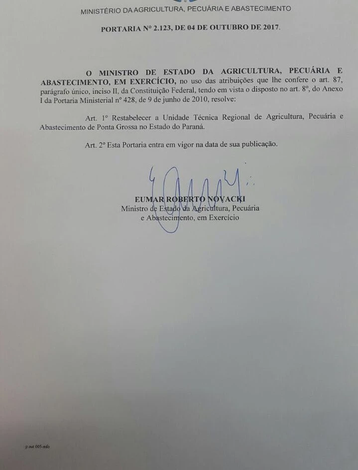 Foi publicada nesta quarta-feira (04) no Diário Oficial da União a Portaria nº 2.123\2017, do Ministério da Agricultura, reestabelecendo a abertura da Unidade Técnica Regional da Agropecuária (UTRA) de Ponta Grossa, que representa uma grande vitória do deputado federal Sandro Alex (PSD) na defesa do setor agropecuário dos Campos Gerais. O Ministério já havia garantido anteriormente a permanência da UTRA de Castro. Dessa forma, as duas cidades ficam com os escritórios do Ministério da Agricultura em funcionamento.